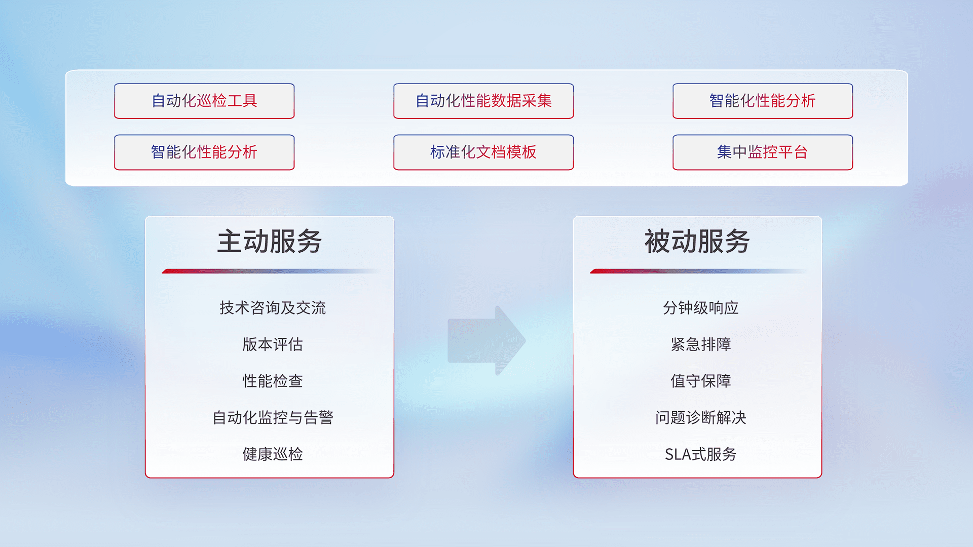 智能化工具和标准化文档,,,,保障服务质量,,,,提供主动服务(包含技术咨询、、、、版本评估、、、、性能检查、、、自动化监控与告警、、、健康巡检)和被动服务包含(分钟级响应、、、、紧急排障、、、、值守保障、、问题诊断解决、、、、SLA服务)。。。。
