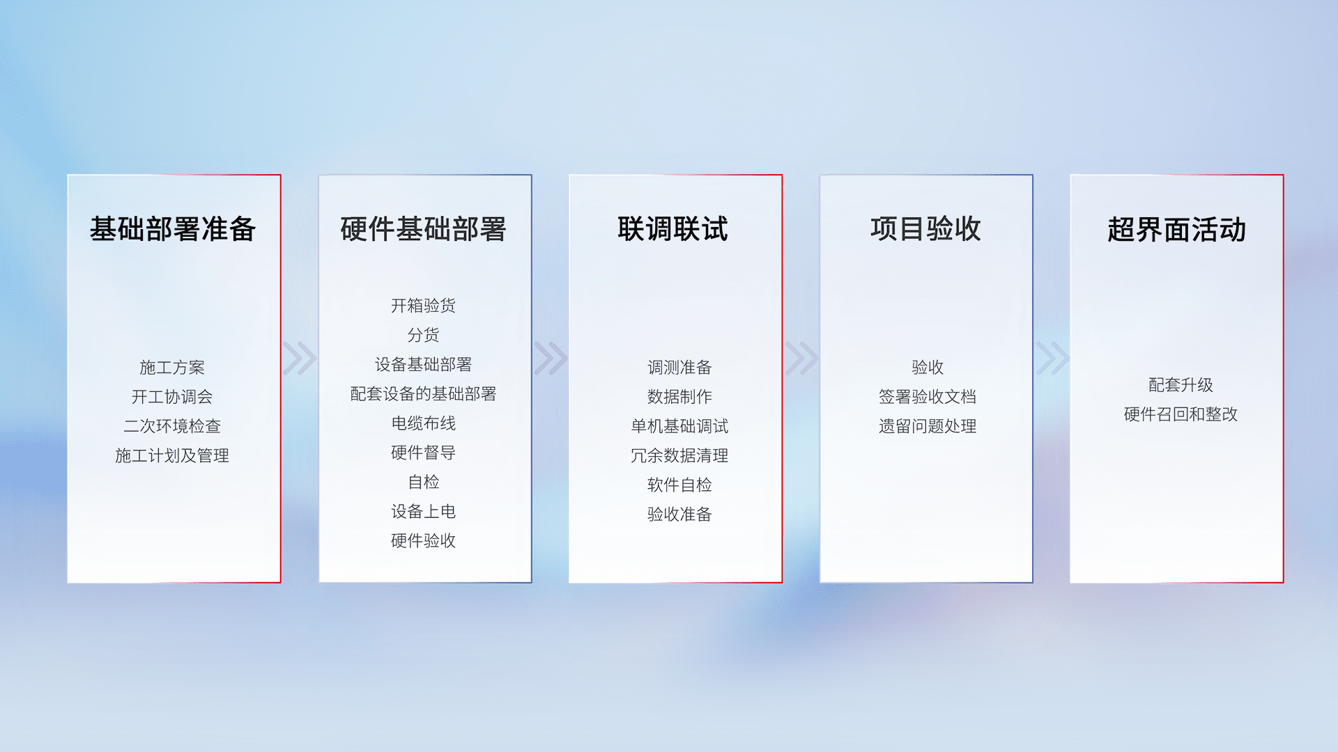 从基础部署准备、、硬件基础部署、、、、联调联试、、、项目验收、、越界面活动的全过程可追溯,,,,保证施工质量和进度。。
